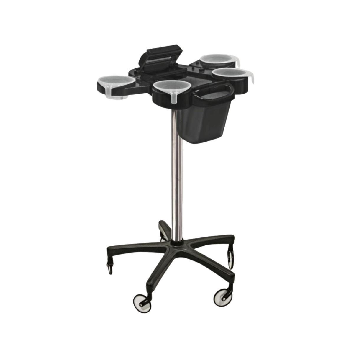 Wózek techniczny wykonany jest z wysokiej jakości tworzywa, które gwarantuje długą żywotność tego produktu. Posiada 4 wyjmowane pojemniki, miejsca na grzebienie i szczotki oraz inne akcesoria. Oprócz tego ma wbudowaną obcinarkę do folii aluminiowej. Wózek jest wyposażony w nowoczesne kółka NO-HAIR Wheels, które są odporne na zabrudzenia i posiadają system zapobiegający wkręcaniu się włosów w łożyska.